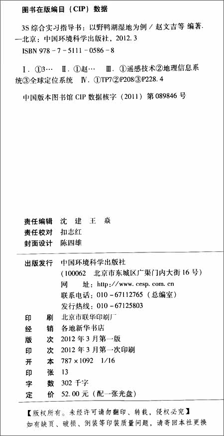 《3S综合实习指导书:以野鸭湖湿地为例》共四章,第一章系统介绍了3S的基本概念、特点与应用概况。第二章系统介绍了3S综合实习的目的、内容、技术流程,以及需要的相关准备工作。第三章介绍了《3S综合实习指导书:以野鸭湖湿地为例》的野外综合实习区——野鸭湖湿地的概况。第四章按照3S的工作流程,分八个实习,分别详细介绍了从线路踏勘、遥感解译、数据库建库到地图输出、实验区生态水文时空演变分析的实习内容与具体操作流程。最后以附录的形式列出了实习报告撰写、数据记录格式、典型湿地植物及其光谱特征等方面的信息。